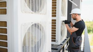 technician working on air conditioning or heat pump outdoor unit. HVAC service, maintenance and repair